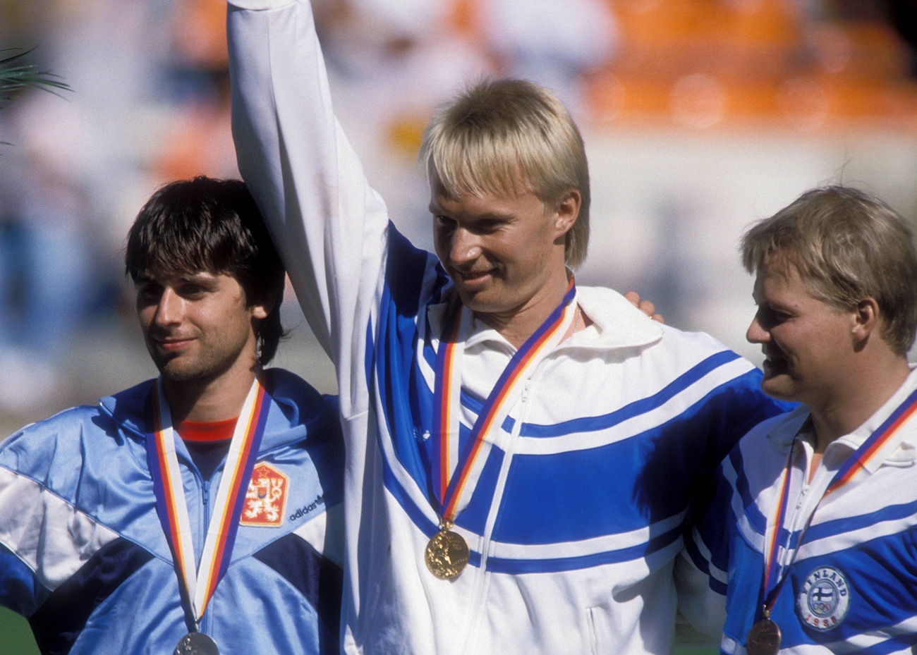 Tapio Korjus juhlii keihäänheiton olympiakultaa Soulin olympialaisissa 1988. Vasemmalla hopeamitalisti Jan Železný ja oikealla pronssimitalisti Seppo Räty. Kuva: All Over Press